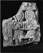 A (broad): Part of two panels separated by a flat-band moulding. On the left edge is a broad step-patterned border (step pattern 1). (i) The remains of two out-turned feet. (ii) Two figures, and possibly remains of a third, are frontal and holding books in their upturned hands. Their heads are wedge-shaped with hood-like haloes, their features lightly incised. They wear knee-length pleated tunics.