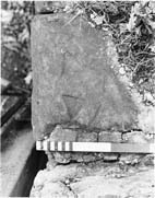 Part of one carved face survives. It has been dressed smooth and on one edge is a deeply incised line which divides the dressed from the rough surface. Part of a cross in relief, type B8, is surrounded by a wide ring, the outer line of which is deeply incised.