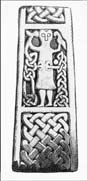 ?A (broad): There are roll mouldings on the edges. None of the horizontal mouldings dividing the face into three shown in Stuart are now visible. (i) Stuart's drawing shows a six-strand plain plait at the top. (ii) A man with two birds on his wrists, a bar piercing his body and falling into rough interlace panels on either side. (iii) A panel of eight-strand plain plait.