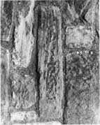 B (narrow): Stuart shows a broad outer and narrow inner moulding containing a step pattern 1 and three panels of closed circuit knots; (i), two closed circuit loops; (ii), two registers of half pattern A with bar terminals; (iii), a bar terminal and start of a half pattern similar to ii. The surviving surface is so weathered that it is impossible to check the drawing in detail. The present effect is very different from Stuart's depiction.