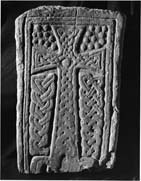 A (top): The slab tapers slightly towards the base of a cross and is framed by a median-incised grooved moulding. In the centre of the frame is a cross, type B6, standing on a rectangular block-plinth. The cross is edged with a crude roll moulding and has a boss centrally placed on the head. The surface of the cross is covered by median-incised plain plaits. In the upper arm this is a four-strand plait which, by ending in a ring, becomes two strands. A similar 'fudging' produces a three-strand plait in the lower upright, in which the strands broaden out skilfully to fill the space. On the horizontal arms is a three-strand plait. The spandrels of the upper arms are filled by pellets, ten on one side, eleven on the other. Below the arms are two panels of plait-work with median-incised strands. On the left a three-strand, plain plait. On the right a four-strand, plain plait.