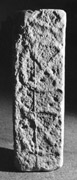 B (narrow): With the decoration truncated at each end of the stone, this face is, again, damaged on one side through subsequent dressing-off. The surviving pattern comprises a mirrored turned pattern formed from two strands. It has a series of Stafford knots (simple pattern E: Cramp 1991, fig. 23) set at regular intervals along the interlace.