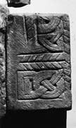 D (long): Between the cable moulding marking the junction between the side and lid of the monument and the zig-zag decorated plinth, the face is divided into two panels – a transverse panel at one end and a longer horizontal one – by a double cable moulding. In the transverse panel there is an interlace knot of type viii (Fig. 10). The interlace in the long horizontal panel also begins with a pattern E knot and a free ring, but this is the start of a four-strand design, probably plaitwork. The interlace strands in both panels have an incised medial line.