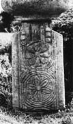 C (broad): This face is laid out in a similar fashion to A, with three circular motifs formed by raised mouldings placed one above the other. The interstices are occupied by similar panels. The decoration within the circular motifs is also similar except that the octofoil figure with blunt petals sits below the sexfoil. The third figure is more complete on this face; enough of the central part of the circular panel is preserved to suggest a four-lobed 'flower' with pointed petals.