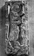 Although this stone was found in use as a coffin lid, this most probably was not its original function. Its taper is not in the right direction for a lid, and it seems reasonable to assume, as have several other commentators, that it adorned the walls of a church in the manner of other large-scale carvings in the later Anglo-Saxon period. The panel has engendered a great deal of commentary (the fullest being Smith 1976) but there is no doubt that the scene depicts the risen Christ holding his cross of Victory and 'harrowing' (plundering) Hell to rescue the imprisoned souls from Satan who is finally conquered and fettered. These events, according to scripture, took place from the time of the Crucifixion, when 'many bodies of the saints which slept arose' (Matthew 27. 52–3); during Christ's three days in the tomb, when 'he went and preached unto the spirits in prison' (I Peter 3. 19); and where the Descent into Hell, the Resurrection and Ascension are explicitly linked: 'Now that he ascended, what is it but that he also descended first into the lower parts of the earth? He that descended is the same also that ascended up far above all heavens' (Ephesians 4. 9–10). Nevertheless Smith notes that 'the Descent into Hell is not recorded as a mystery of faith until the early 6th century, when it appears in a Gallican creed', and in the Apostles' Creed by c. 750 (Smith 1976, 101).