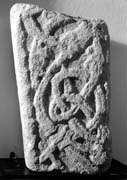 A (broad): A roll moulding encloses an elaborately interlaced and well cut plant-scroll. At the base is a straight stalk tipped by a triple leaf or berry bunch; bottom right, a ridged node ends in a triple strand with a central berry bunch on a straight stem; the uppermost strand forms an irregular knot terminating in a ridged triangular leaf, and touches another worn trumpet node, from which sprouts a strand which encloses a single long triangular leaf with notched edges. The strands were median-incised but are very worn. (Length of leaves 8 cm x 4 cm, width of strand 1 cm.)