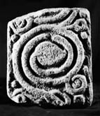 The surviving face carries traces of a roll-moulding border to the left. One complete spiral of a single-stemmed scroll survives with traces of the adjacent scroll-spirals above and below. At the centre of the spiral is a large heart-shaped leaf whilst the spiral produces a spiralling offshoot in the lower right corner. At the point where the stem and offshoot part there is a scooped pellet on the end of a stiff stalk and there are other loose pellets set around the composition.