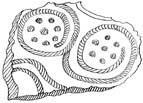 If the drawing is re-aligned so that the fruiting shoots are set to the right, then the fragment can be interpreted as one showing a typical Lune valley scroll, combining a 'western split-stem' with tightly spiralled offshoots, which is familiar on several shafts at Heysham, Lancaster and Halton (Chapter IV, p. 20, Fig. 11). The pelta-like arrangement of the fruiting spirals is closely paralleled at Heversham and Lowther in Westmorland (Bailey and Cramp 1988, ills. 354, 439).