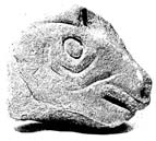 The only surviving photograph shows an animal head facing right, carved on one side only of a shaped stone. The animal has a round eye defined by an incised circle which is surrounded by a slightly raised circular moulding. Between the eye and mouth is a Y-shaped moulding defined by two incised lines. The mouth is represented as a deeply cut rectangle and the snub nose has a round nostril. There are uncut areas of stone above the brow and below the throat of the beast. The reverse side may have been squared towards the back.